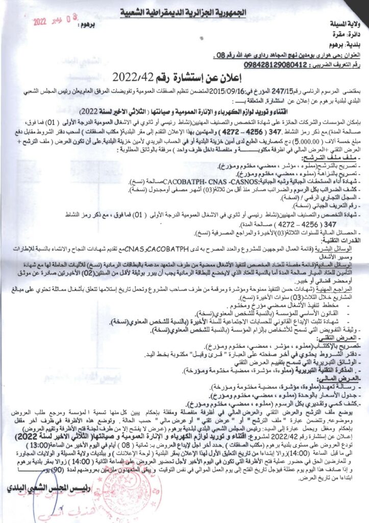 استشارة المتعلقة بـ : اقتناء وتوريد لوازم الكهرباء والإنارة العمومية وصيانتها (الثلاثي الأخير لسنة 2022)6 نوفمبر، 20220 26 شاركها فيسبوك X مشاركة عبر البريد طباعة