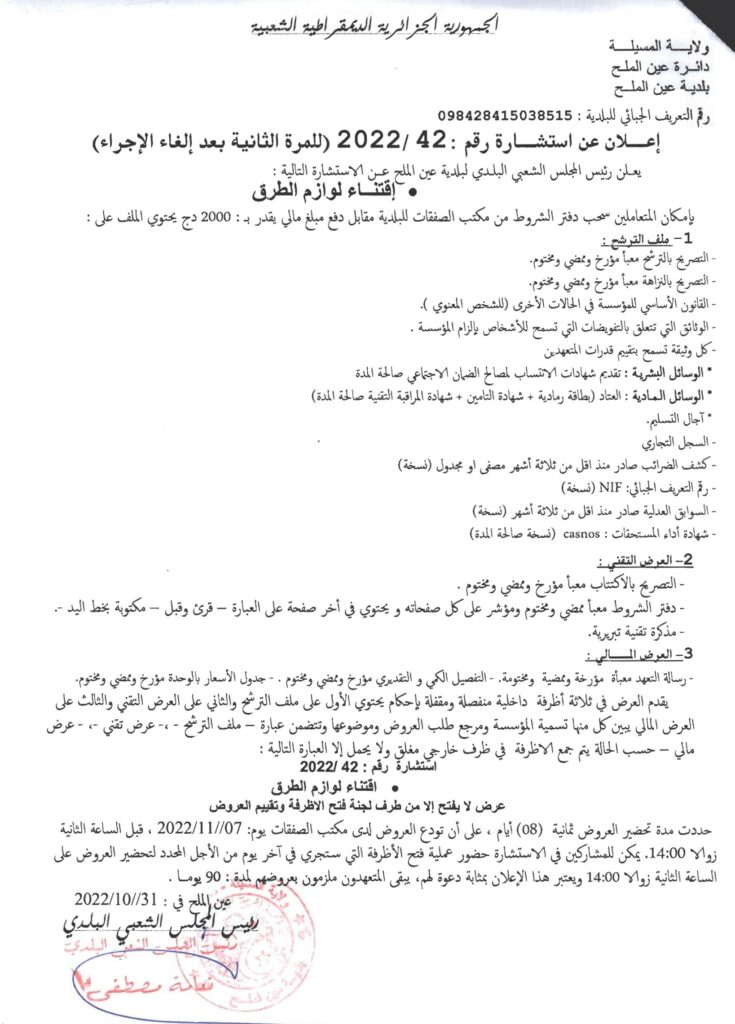 استشارة خاصة بـ : إقتناء لوازم الطرق