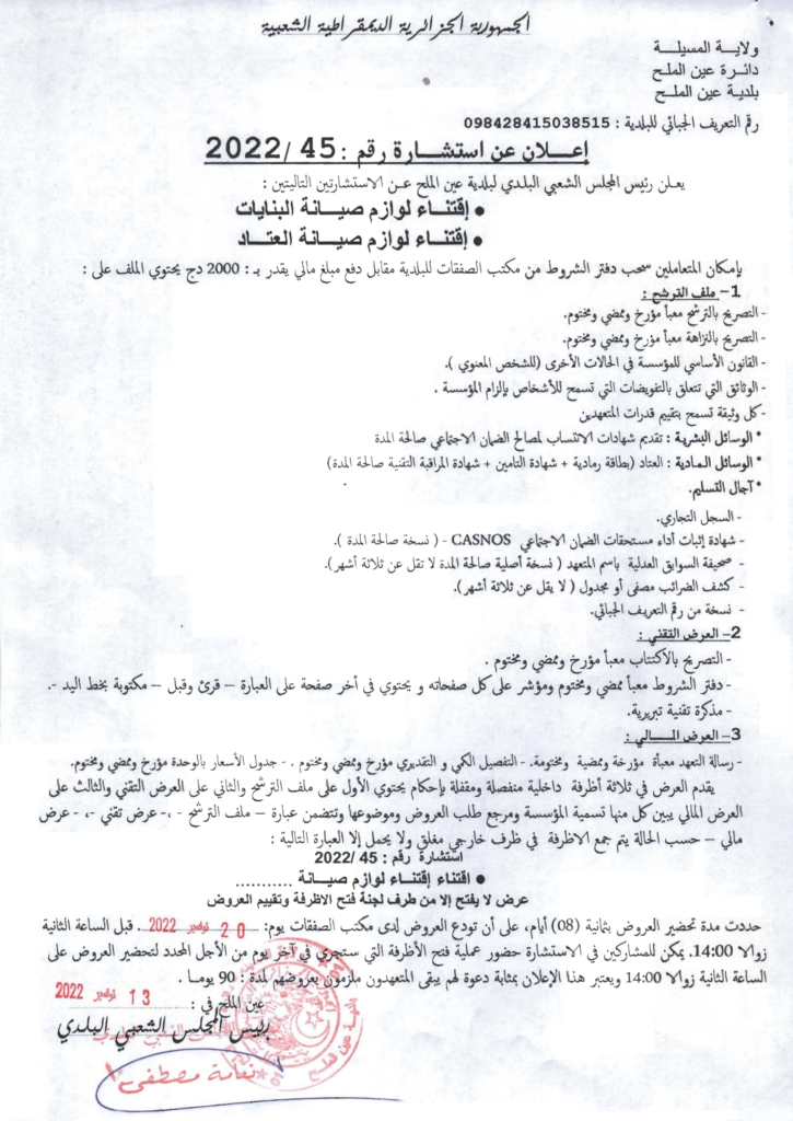 استشارتين التاليتين:اقتناء لوازم صيانة البنايات.اقتناء لوازم صيانة العتاد16 نوفمبر، 20220 29 شاركها فيسبوك X مشاركة عبر البريد طباعة