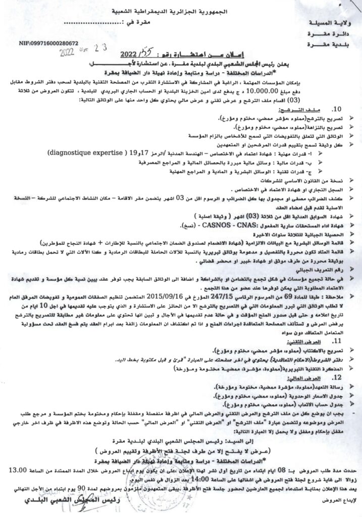 إعلان عن استشارة 2022/55: الدراسات المختلفة – دراسة ومتابعة وإعادة تهيئة دار الضيافة بمقرة