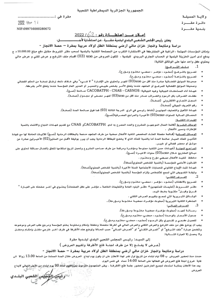 إعلان عن استشارة 2022/62: دراسة ومتابعة وانجاز خزان أرضي مائي بمنطقة الظل أولاد عريبة بمقرة -حصة الإنجاز-