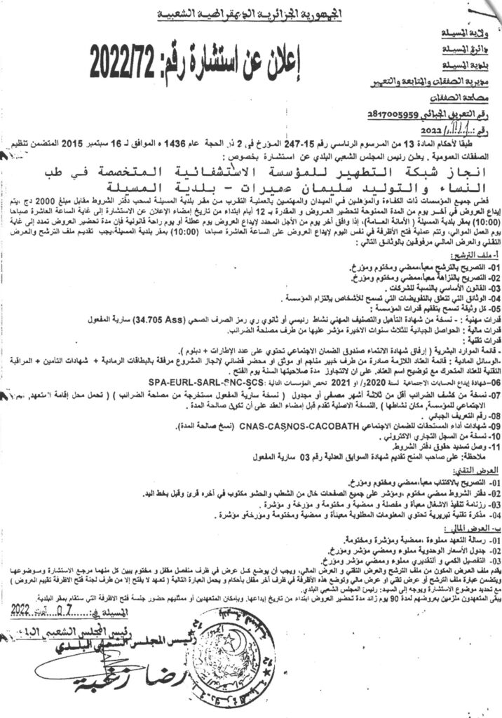 استشارة بخصوص: انجاز شبكة التطهير للمؤسسة الإستشفائية المتخصصة في طب النساء والتوليد سليمان عميرات بلدية المسيلة11 أغسطس، 20220 7 شاركها فيسبوك X مشاركة عبر البريد طباعة