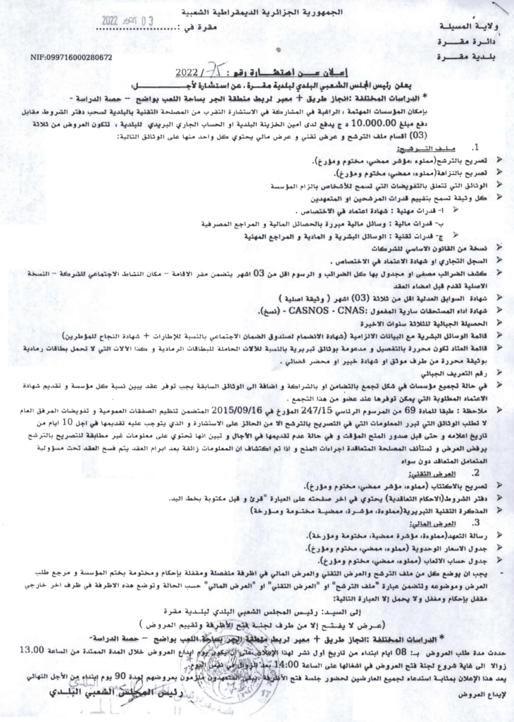 استشارة من أجل: الدراسات المختلفة : انجاز طريق + معبر لربط منطقة الجر بساحة اللعب بواضح -حصة الدراسة-4 أكتوبر، 20220 20 شاركها فيسبوك X مشاركة عبر البريد طباعة