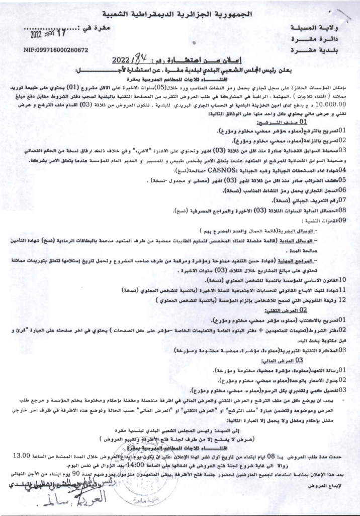 استشارة لأجل: اقتناء ثلاجات للمطاعم المدرسية بمقرة19 أكتوبر، 20220 44 شاركها فيسبوك X مشاركة عبر البريد طباعة