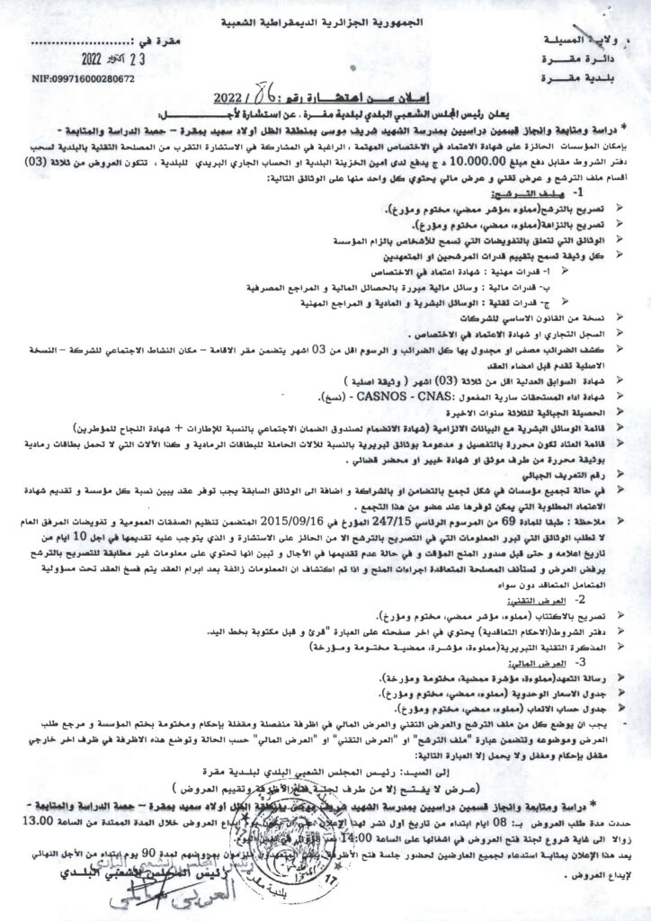 اجراء استشارة من أجل: دراسة ومتابعة وانجاز قسمين دراسيين بمدرسة الشهيد شريف موسى بمنطقة الظل اولاد سعيد24 أكتوبر، 20220 12 شاركها فيسبوك X مشاركة عبر البريد طباعة