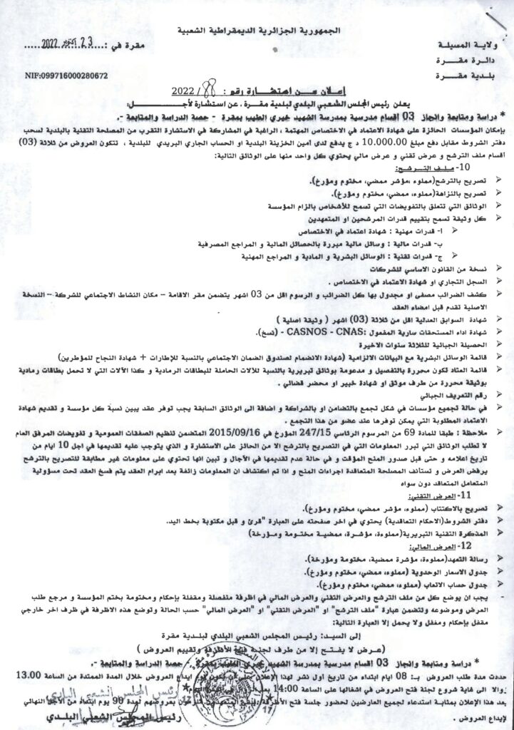 استشارة من أجل: دراسة ومتابعة وانجاز 03 أقسام مدرسية بمدرسة الشهيد خيري الطيب بمقرة -حصة الدراسة والمتابعة-24 أكتوبر، 20220 4 شاركها فيسبوك X مشاركة عبر البريد طباعة