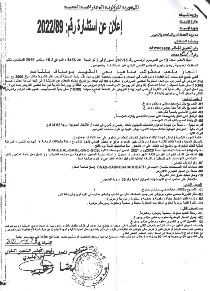 استشارة بخصوص: إنجاز ملعب معشوشب صناعيا بحي الشهيد بوضياف بلقاسم1 ديسمبر، 20220 8 شاركها فيسبوك X مشاركة عبر البريد طباعة