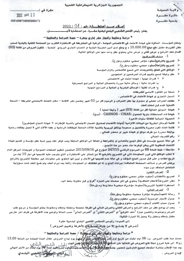 استشارة لأجل: دراسة ومتابعة وإنجاز مقر إداري بمقرة -حصة الدراسة والمتابعة-24 أكتوبر، 20220 9 شاركها فيسبوك X مشاركة عبر البريد طباعة