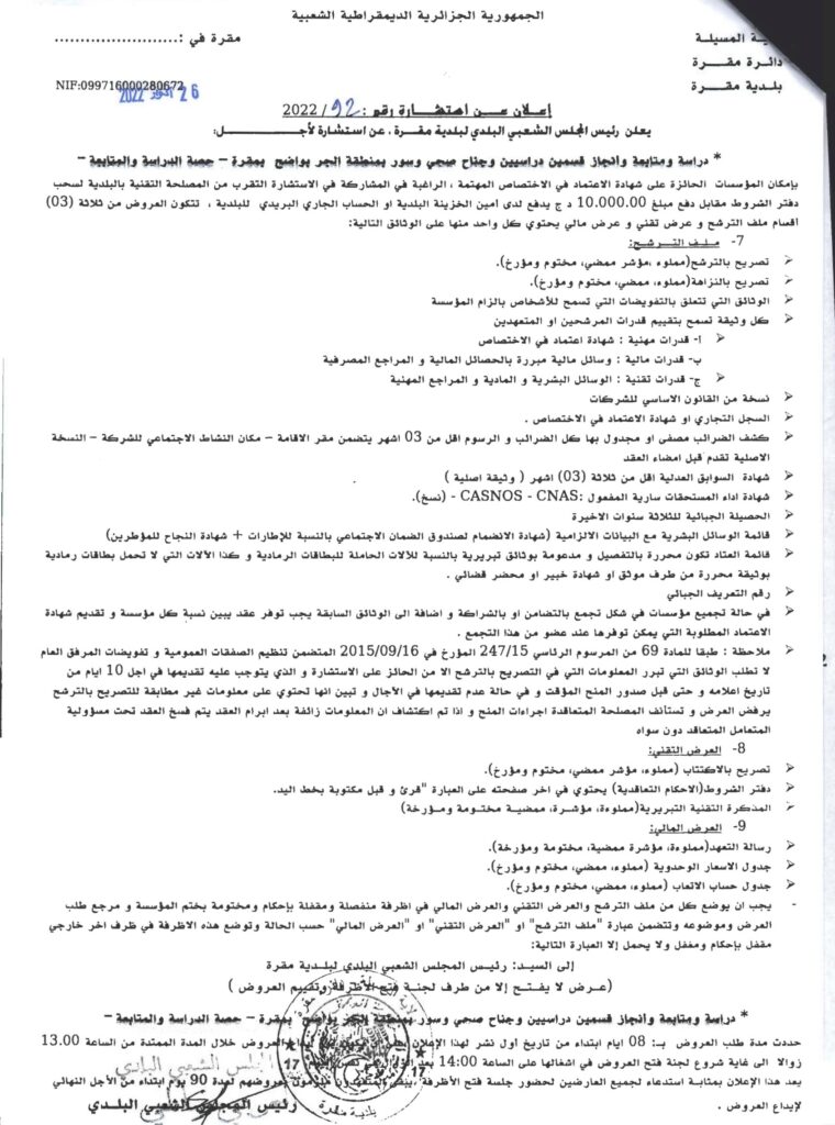 استشارة من أجل: دراسة ومتابعة وإنجاز قسمين دراسيين وجناح صحي وسور بمنطقة الجر بواضح بمقرة -حصة الدراسة والمتابعة-27 أكتوبر، 20220 33 شاركها فيسبوك X مشاركة عبر البريد طباعة