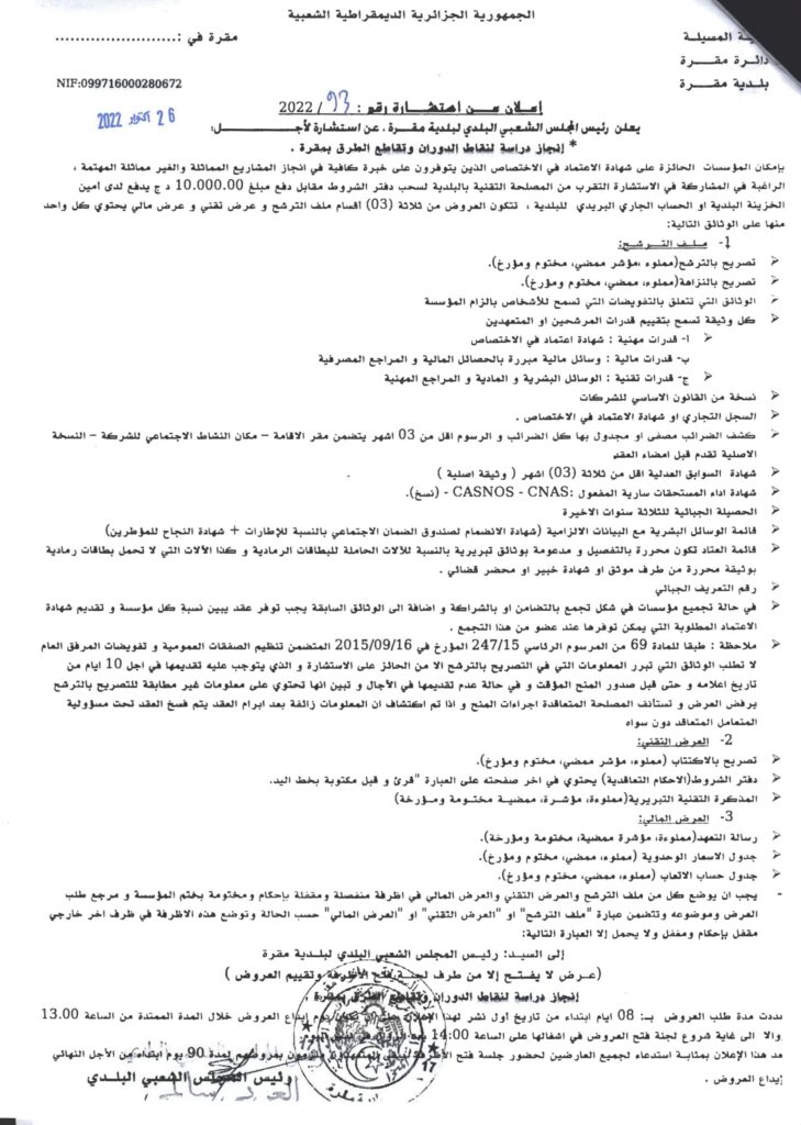 استشارة من أجل: إنجاز دراسة لنقاط الدوران وتقاطع الطرق بمقرة627 أكتوبر، 20220 23 شاركها فيسبوك X مشاركة عبر البريد طباعة