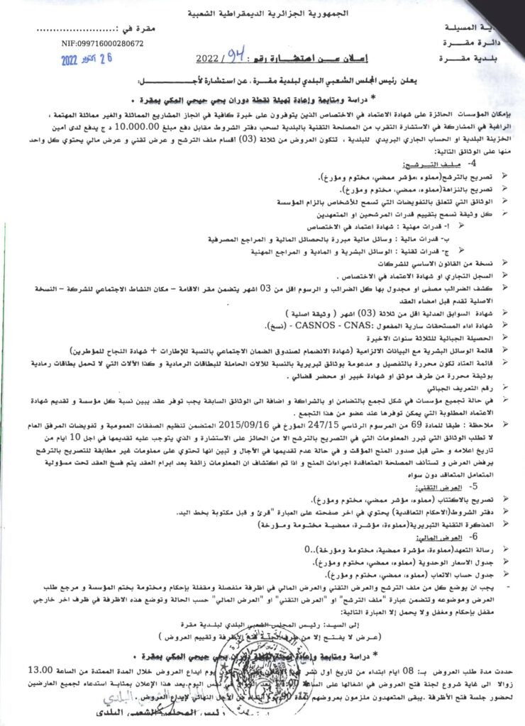استشارة من أجل: دراسة ومتابعة وإعادة تهيئة نقطة دوران بحي حيحي المكي بمقرة27 أكتوبر، 20220 16 شاركها فيسبوك X مشاركة عبر البريد طباعة