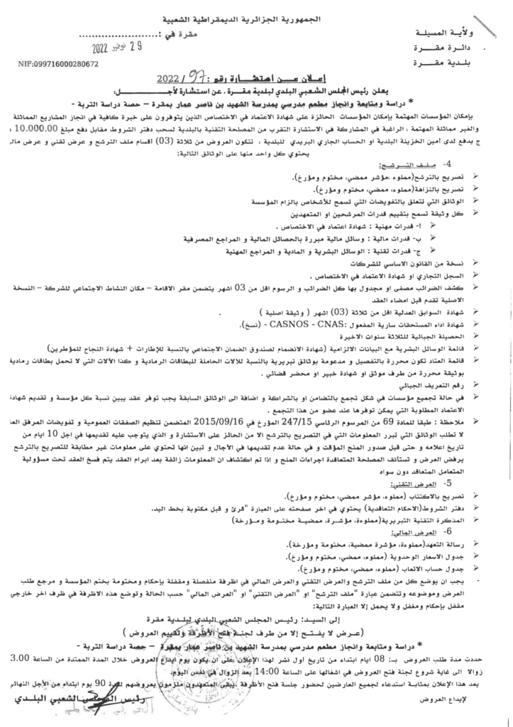 استشارة لأجل: دراسة ومتابعة وإنجاز مطعم بمدرسة الشهيد بن ناصر عمار -حصة دراسة التربة-30 نوفمبر، 20220 16 شاركها فيسبوك X مشاركة عبر البريد طباعة