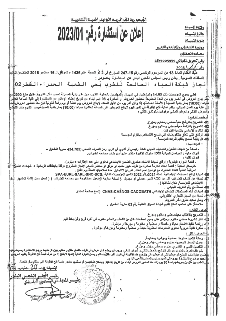 استشارة بخصوص: انجلز شبكة المياه الصالحة للشرب بحي الشعبة الحمراء الشطر 0222 مارس، 20230 15 شاركها فيسبوك X مشاركة عبر البريد طباعة