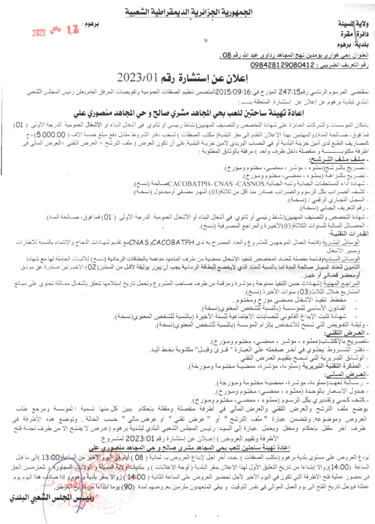استشارة متعلقة بـ : إعادة تهيئة ساحتين للعب بحي المجاهد مشري صالح وحي المجاهد منصوري علي18 يناير، 20230 38 شاركها فيسبوك X مشاركة عبر البريد طباعة