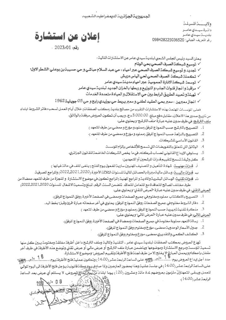 إعلان عن استشارة 2023/01 بلدية سيدي عامر