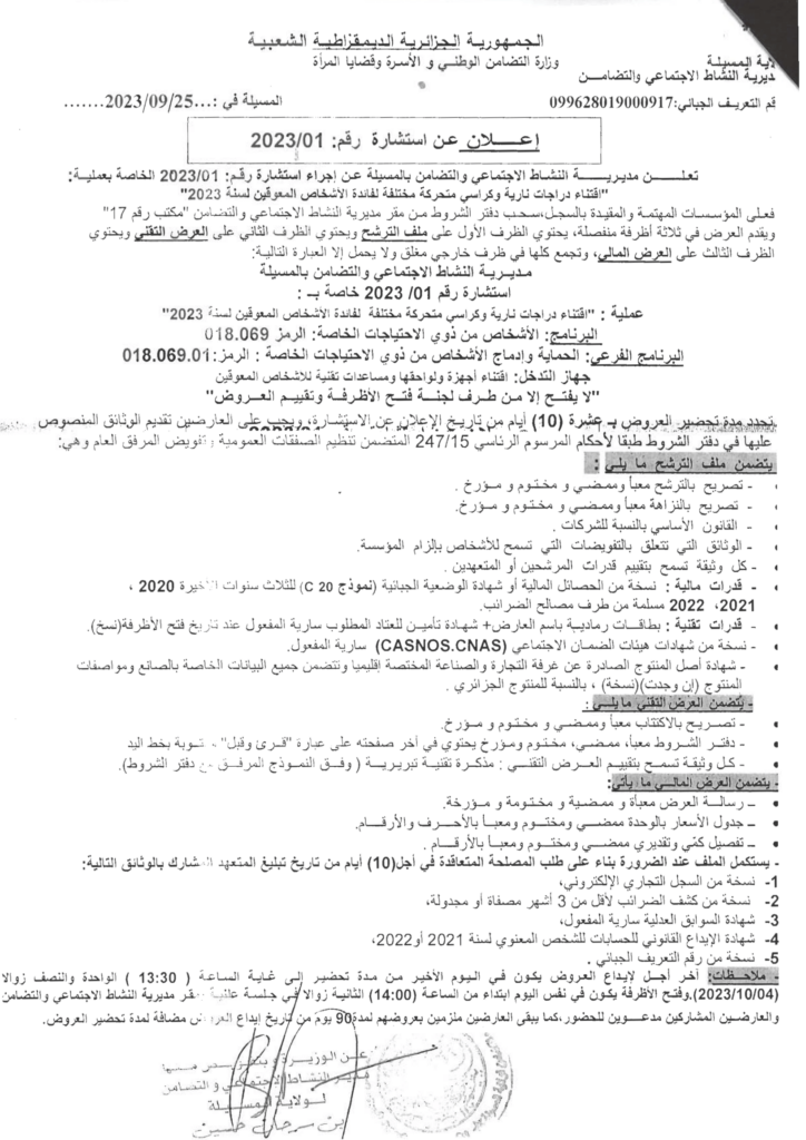 إعلان عن استشارة 2023/01 مديرية النشاط الاجتماعي والتضامن
