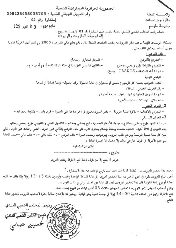 استشارة لانجاز مشروع: اقتناء مادة المازوت والزيوت لبلدية سليم8 أكتوبر، 20230 3 شاركها فيسبوك X مشاركة عبر البريد طباعة