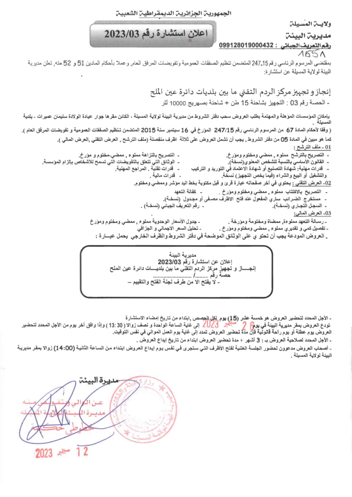 استشارة من أجل: دراسة وانجاز وتجهيز مركز الردم التقني ما بين البلديات بعين الملح الحصة 313 سبتمبر، 20230 49 شاركها فيسبوك X مشاركة عبر البريد طباعة