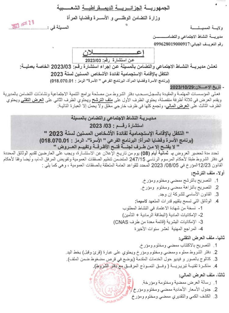 استشارة خاصة بعملية: التكفل بالاقامة الاستجمامية لفائدة الاشخاص المسنين لسنة 202329 أكتوبر، 20230 41 شاركها فيسبوك X مشاركة عبر البريد طباعة