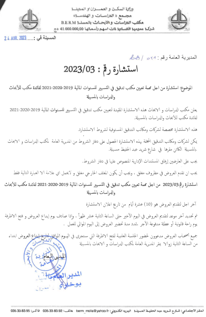 إعلان عن استشارة 2023/03 من أجل مهمة تعيين مكتب تدقيق في التسيير للسنوات المالية 2019-2020-2021 لفائدة مكتب الأبحاث والدراسات بالمسيلة