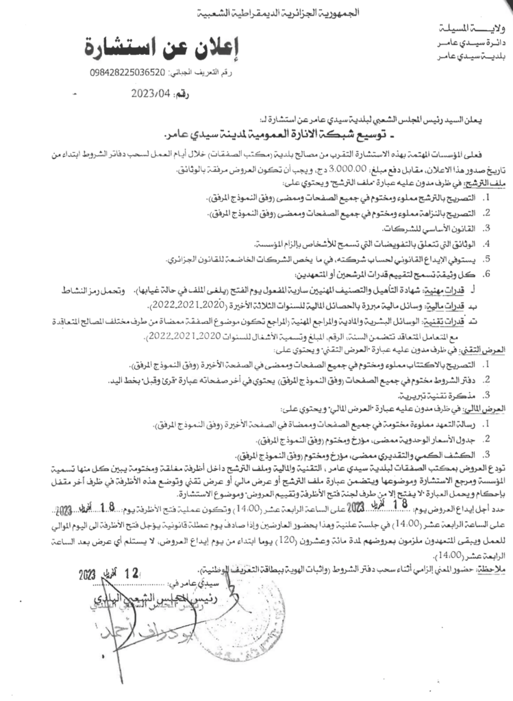 استشارة لـ : توسيع شبكة الانارة العمومية لمدينة سيدي عامر19 أبريل، 20230 28 شاركها فيسبوك X مشاركة عبر البريد طباعة