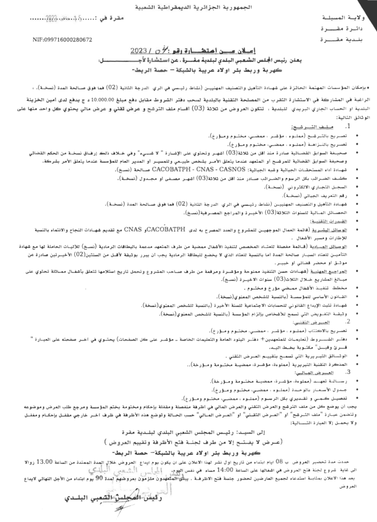 استشارة لأجل: كهربة وربط بئر أولاد عربية بالشبكة -حصة الربط-17 يناير، 20230 48 شاركها فيسبوك X مشاركة عبر البريد طباعة
