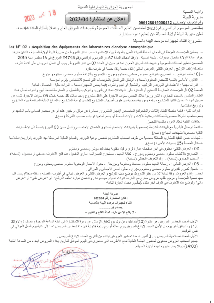 استشارة من أجل: اقتناء تجهيزات مرصد البيئة بالمسيلة22 أكتوبر، 20230 15 شاركها فيسبوك X مشاركة عبر البريد طباعة