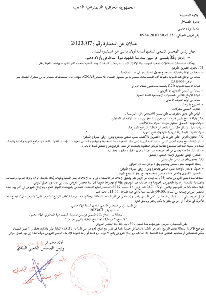 استشارة قصد: انجاز قسمين دراسيين بمدسة الشهيد ميرة المخلوفي بأولاد دهيم21 مايو، 20230 53 شاركها فيسبوك X مشاركة عبر البريد طباعة