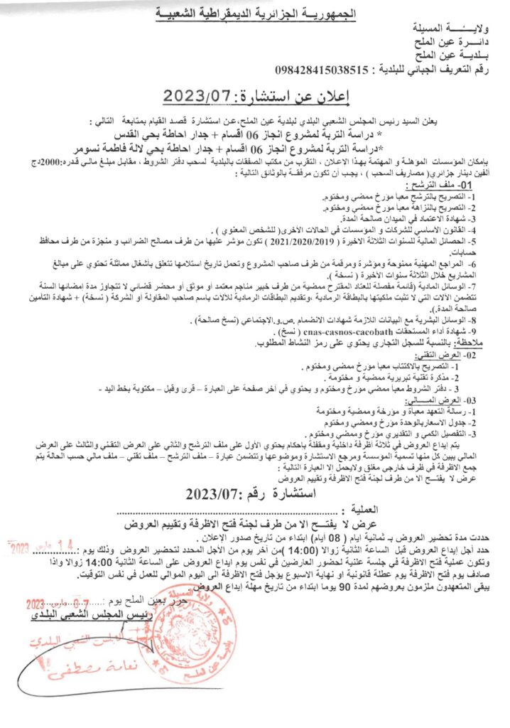 استشارة قصد القيام بمتابعة التالي:دراسة التربة لمشروع انجاز 06 أقسام + جدار إحاطة بحي القدس.دراسة التربة لمشروع انجاز 06 أقسام + جدار إحاطة بحي لالة فاطمة نسومر.13 مارس، 20230 34 شاركها فيسبوك X مشاركة عبر البريد طباعة