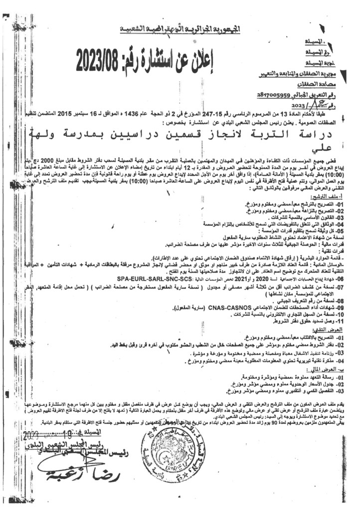 استشارة بخصوص: دراسة التربة لانجاز قسمشين دراسيين بمدرسة ولهة22 مارس، 20230 5 شاركها فيسبوك X مشاركة عبر البريد طباعة