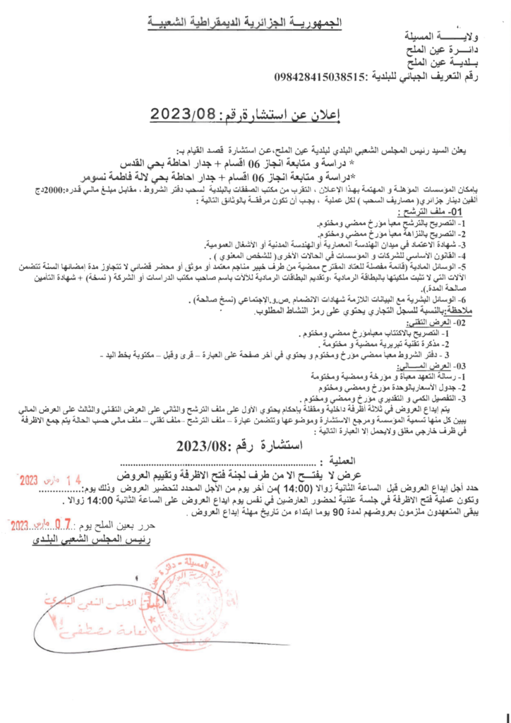 استشارة قصد القيام بـ :دراسة ومتابعة انجاز 06 أقسام + جدار احاطة بحي القدس.دراسة ومتابعة انجاز 06 اقسام + جدار احاطة بحي لالة فاطمة نسومر.13 مارس، 20230 29 شاركها فيسبوك X مشاركة عبر البريد طباعة
