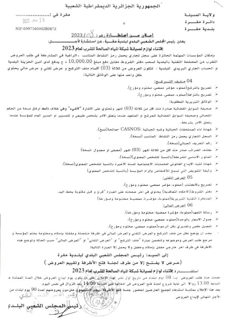 استشارة لأجل: اقتناء لوازم لصيانة شبكة المياه الصالحة للشرب لعام 202329 يناير، 20230 23 شاركها فيسبوك X مشاركة عبر البريد طباعة