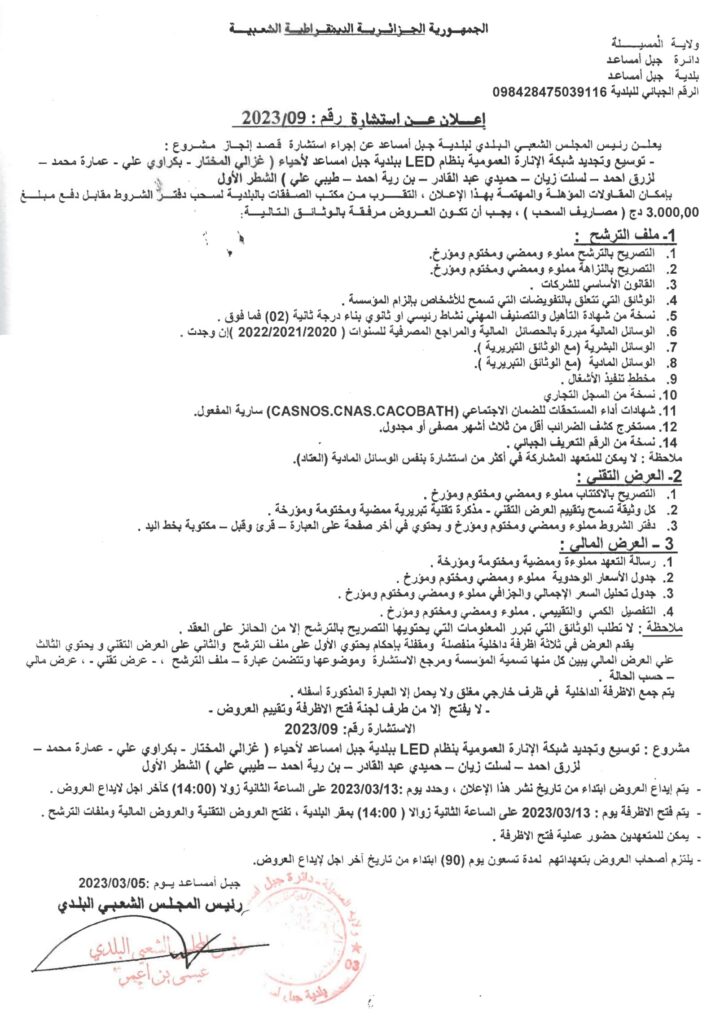 استشارة لأجل: توسيع وتجديد شبكة الإنارة العمومية بنظام LED عبر أحياء بلدية جبل امساعد9 مارس، 20230 3 شاركها فيسبوك X مشاركة عبر البريد طباعة