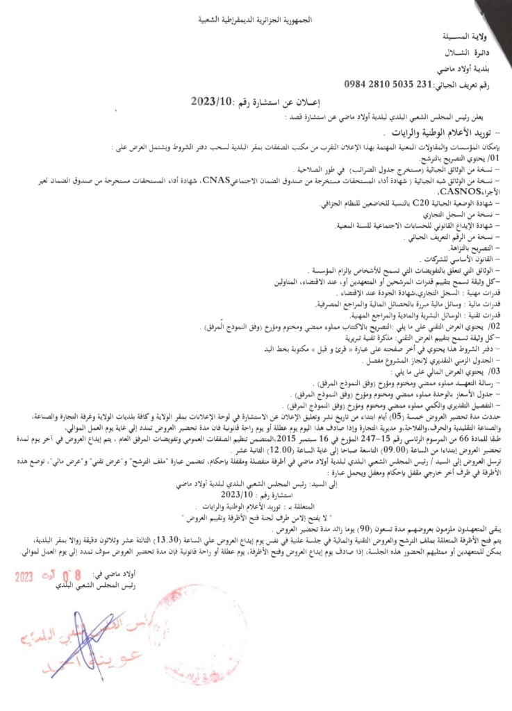 استشارة من أجل: توريد الأعلام الوطنية والرايات13 أغسطس، 20230 1 شاركها فيسبوك X مشاركة عبر البريد طباعة