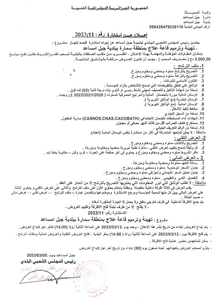 استشارة قصد انجاز مشروع: تهيئة وترميم قاعة علاج بمنطقة سمارة9 مارس، 20230 3 شاركها فيسبوك X مشاركة عبر البريد طباعة