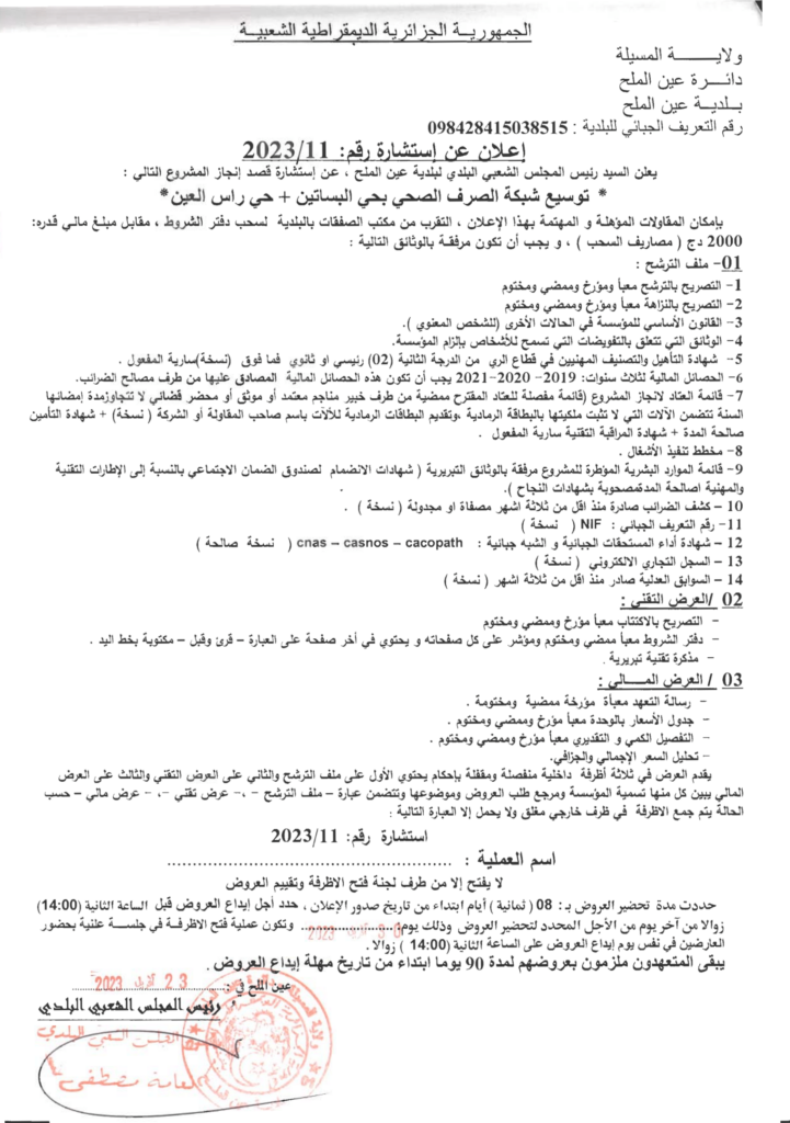 استشارة قصد انجاز المشروع التالي: توسيع شبكة الصرف الصحي بحي البساتين + حي رأس العين25 أبريل، 20230 42 شاركها فيسبوك X مشاركة عبر البريد طباعة