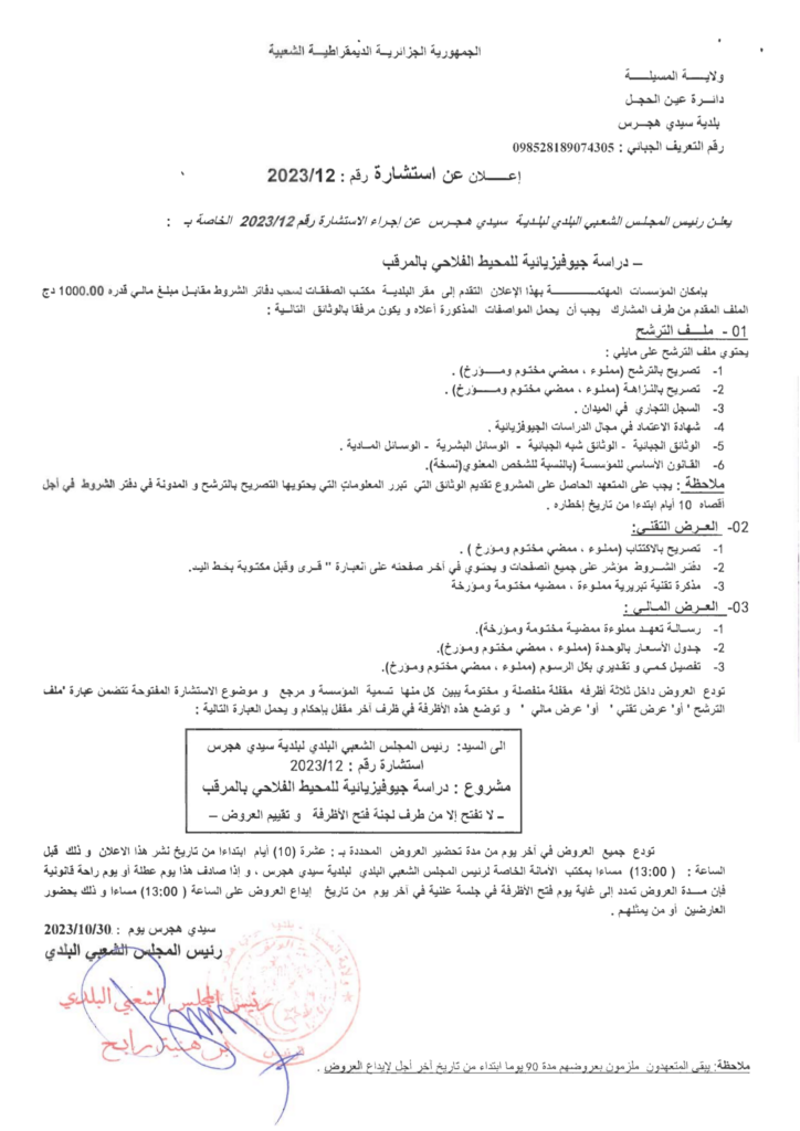 استشارة من أجل: دراسة جيوفيزيائية للمحيط الفلاحي بالمرقب5 نوفمبر، 20230 0 شاركها فيسبوك X مشاركة عبر البريد طباعة