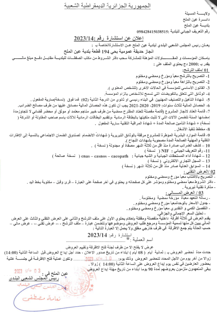 إعلان عن استشارة 2023/14 انجاز حديقة عمومية بحي 194 قطعة/ بلدية عين الملح
