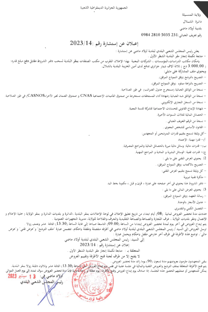 استشارة من أجل: متابعة تكملة انجاز مقر البلدية الشطر الأول14 سبتمبر، 20230 61 شاركها فيسبوك X مشاركة عبر البريد طباعة