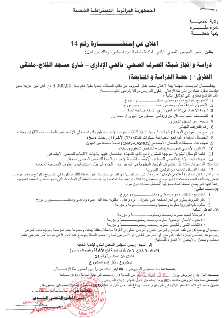 استشارة من أجل: دراسة وانجاز شبكة الصرف الصحي بعدة أحياء25 أبريل، 20230 26 شاركها فيسبوك X مشاركة عبر البريد طباعة