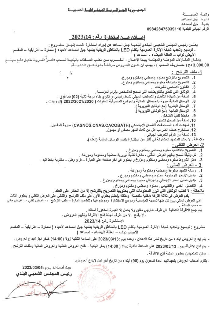 استشارة قصد انجاز مشروع: توسيع وتجديد شبكة الإنارة العمومية بنظام LED بالمناطق الريفية9 مارس، 20230 2 شاركها فيسبوك X مشاركة عبر البريد طباعة