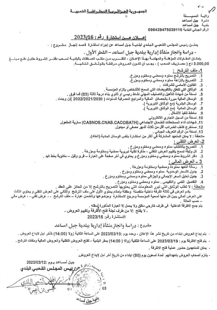 استشارة خاصة بـ :دراسة وانجاز منشأة إدارية ببلدية جبل امساعد14 مارس، 20230 19 شاركها فيسبوك X مشاركة عبر البريد طباعة