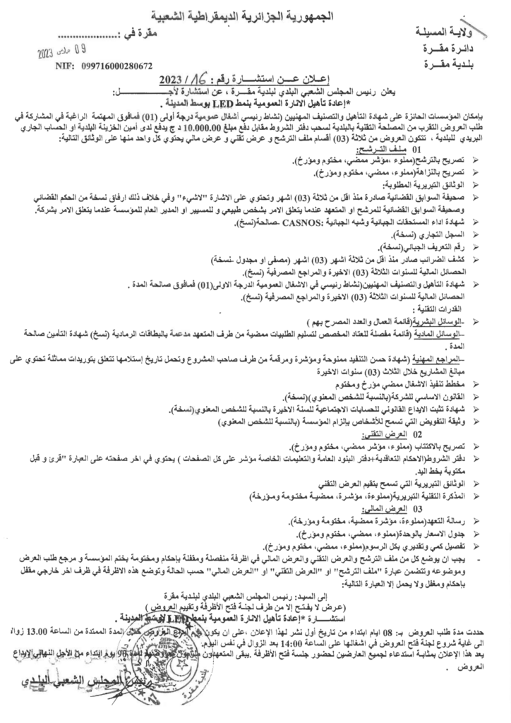استشارة لأجل: اعادة تأهيل الانارة العمومية LED بوسط المدينة12 مارس، 20230 3 شاركها فيسبوك X مشاركة عبر البريد طباعة