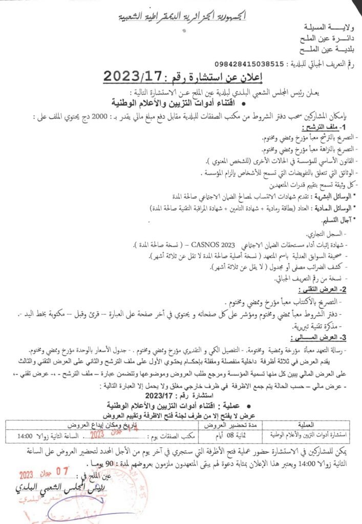 استشارة 17 خاصة بـ : إقتناء أدوات التزيين والأعلام الوطنية11 يونيو، 20230 6 شاركها فيسبوك X مشاركة عبر البريد طباعة