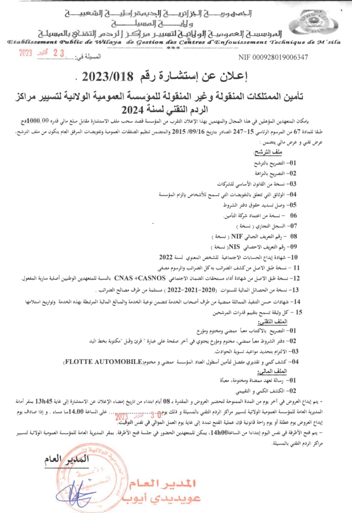 استشارة خاصة بـ : تأمين الممتلكات المنقولة وغير المنقولة للمؤسسة العمومية الولائية لتسيير مراكز الردم التقني لسنة 202425 أكتوبر، 20230 17 شاركها فيسبوك X مشاركة عبر البريد طباعة