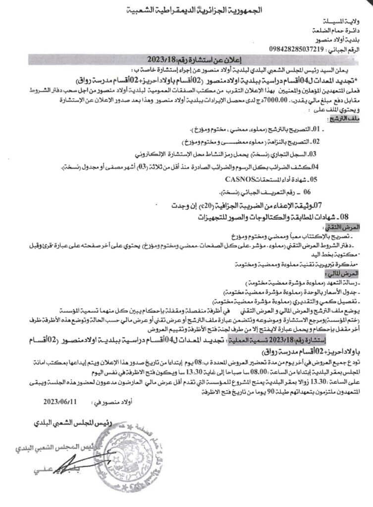 استشارة خاصة بـ : تجديد المعدات لـ 4 أقسام دراسية ببلدية أولاد منصور14 يونيو، 20230 48 شاركها فيسبوك X مشاركة عبر البريد طباعة