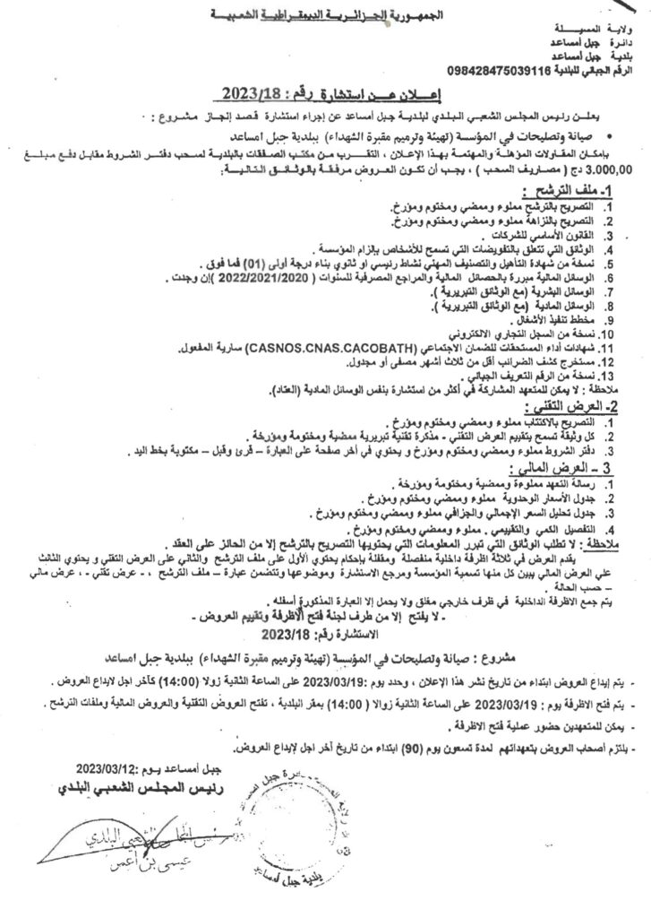 إعلان عن استشارة 2023/18 بلدية جبل امساعد