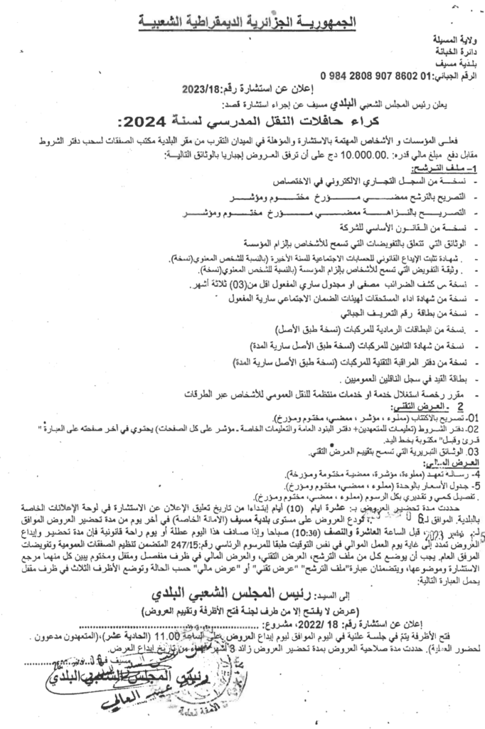 استشارة من أجل: كراء حافلات للنقل المدرسي لسنة 2024 بلدية مسيف12 نوفمبر، 20230 19 شاركها فيسبوك X مشاركة عبر البريد طباعة
