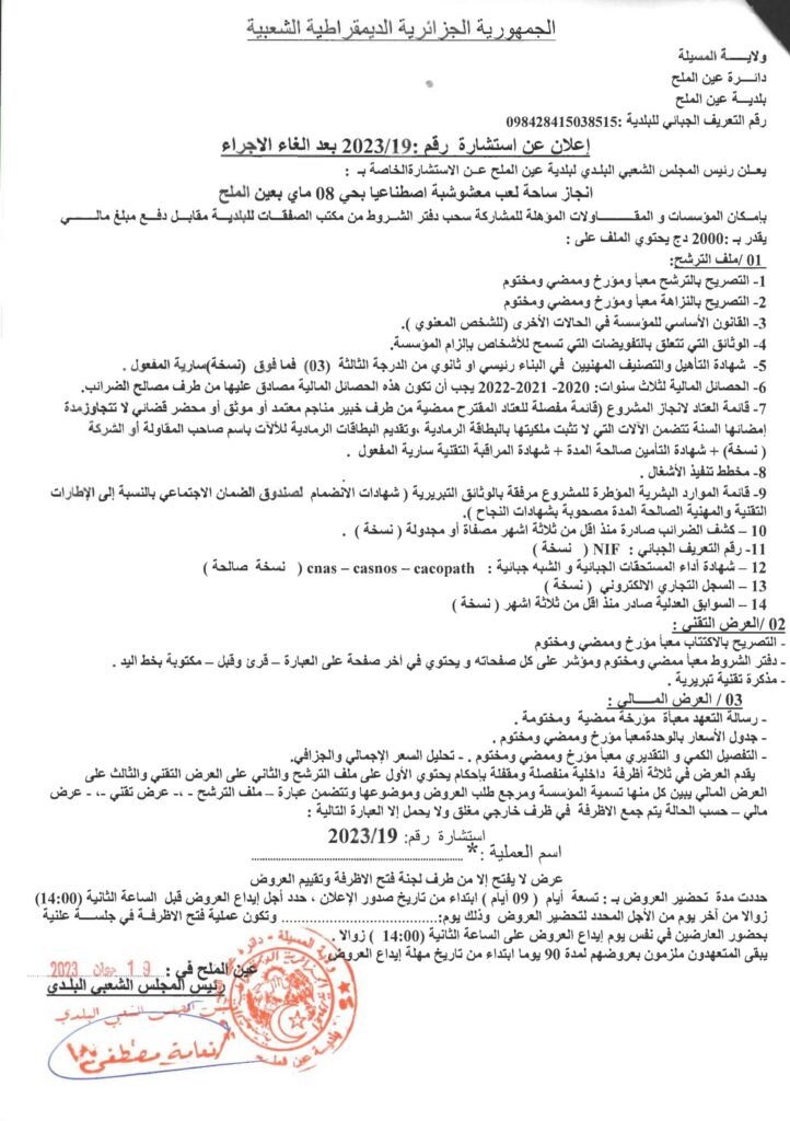 استشارة خاصة بـ : انجاز ساحة لعب معشوشبة اصطناعيا بحي 8 ماي22 يونيو، 20230 32 شاركها فيسبوك X مشاركة عبر البريد طباعة
