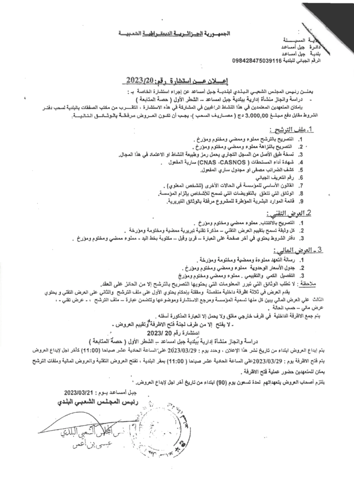 استشارة خاصة بــ : دراسة وانجاز منشأة ادارية بالبلدية23 مارس، 20230 50 شاركها فيسبوك X مشاركة عبر البريد طباعة